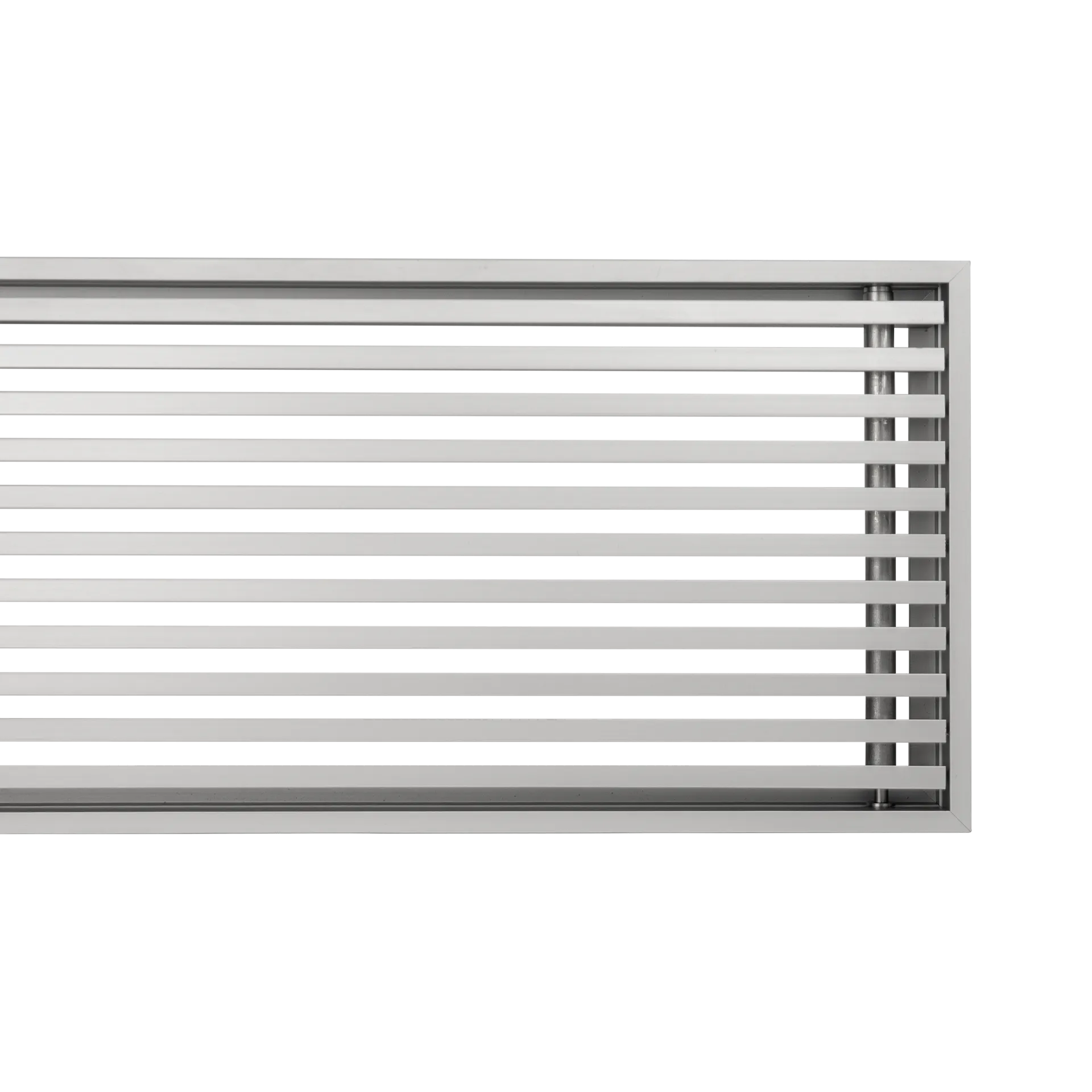 The grille can be supplied with a range of bar profiles and spacings to suit airflow requirements and design preference. Aluminium construction ensures a lightweight, corrosion-resistant solution that is easy to handle and install while still providing good rigidity for everyday use. Units can be supplied in a brushed mill finish or powder coated to any RAL colour, allowing full visual integration with surrounding floor finishes or architectural elements.