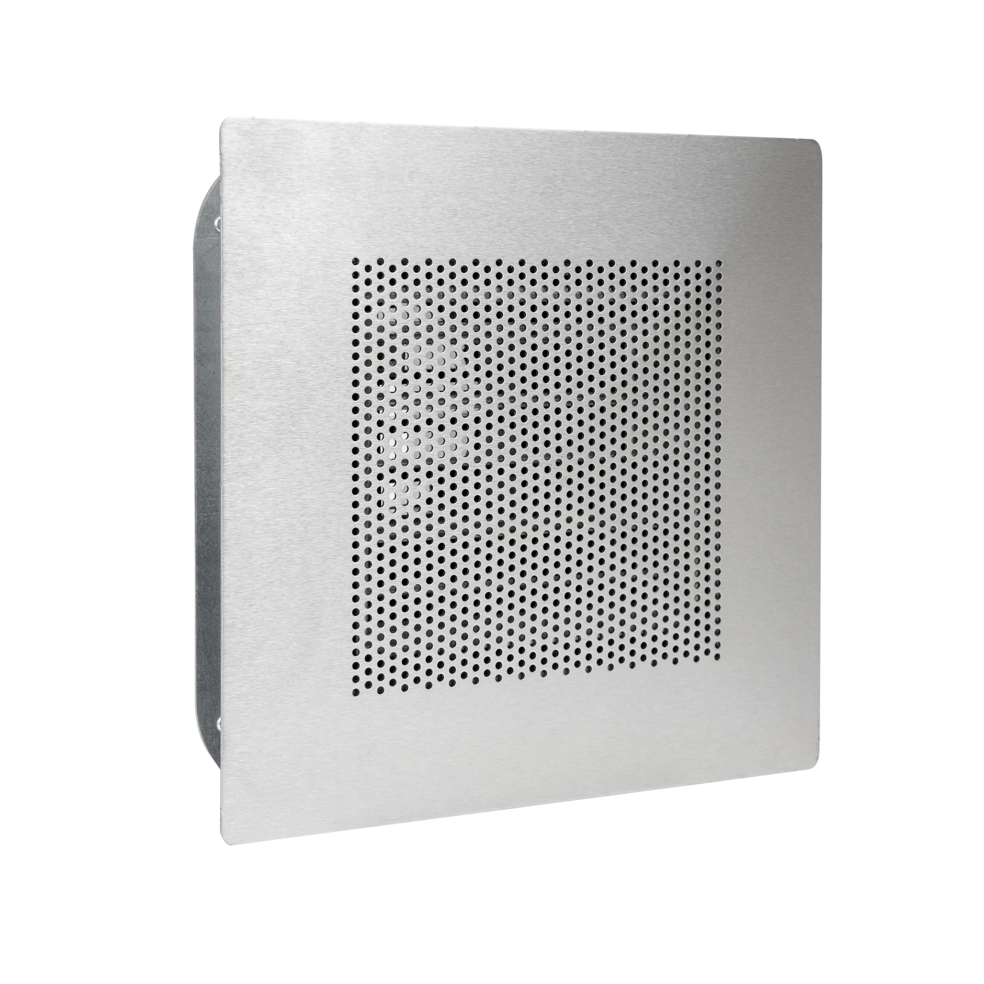 The unit can be supplied with a matching stainless steel subframe and optional pressure-controlled or restricted-airflow plenums where system design requires airflow limitation for safety. Fixings can be concealed or tamper-resistant depending on the specification. A range of finishes is available including brushed, satin, and powder-coated stainless steel to meet project requirements.